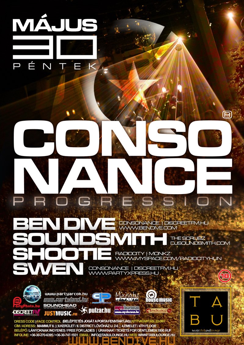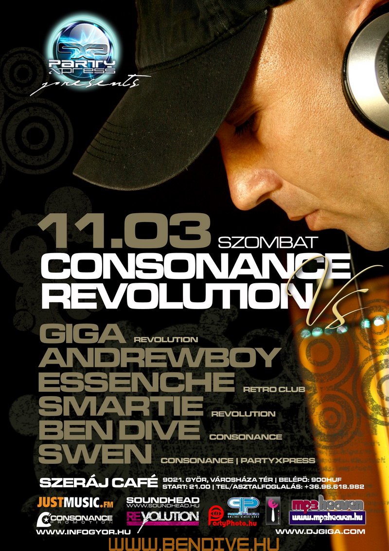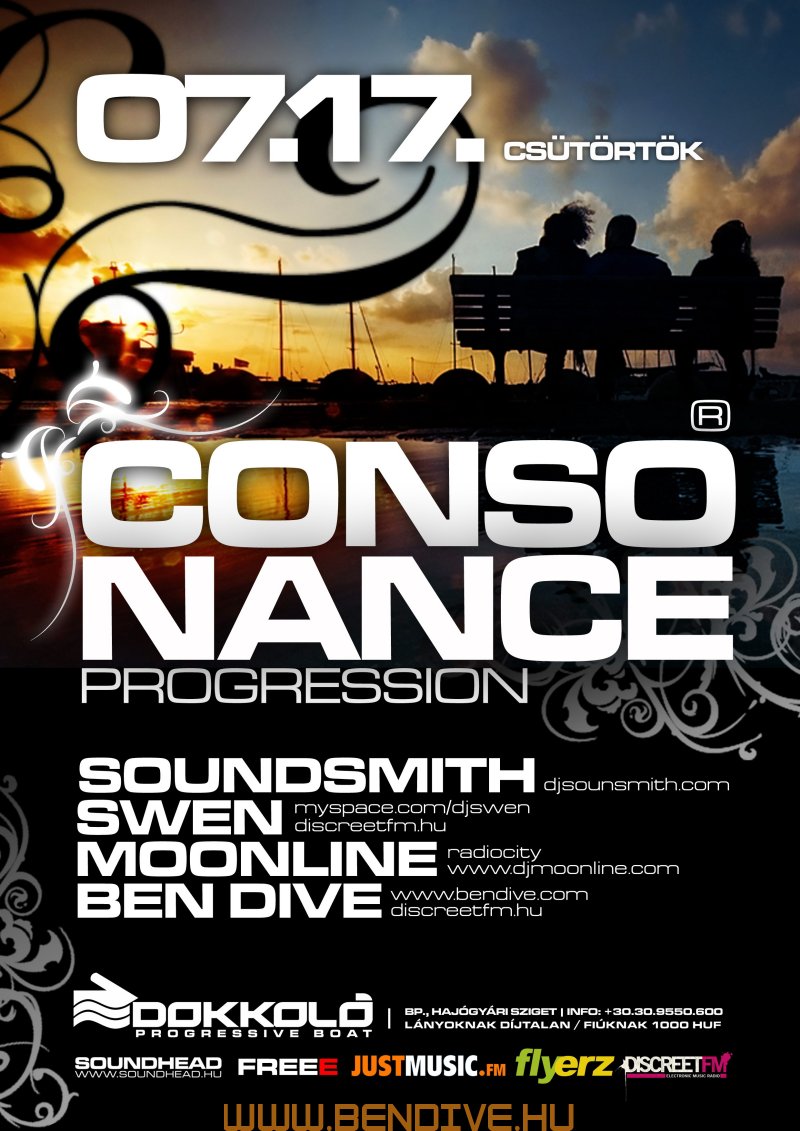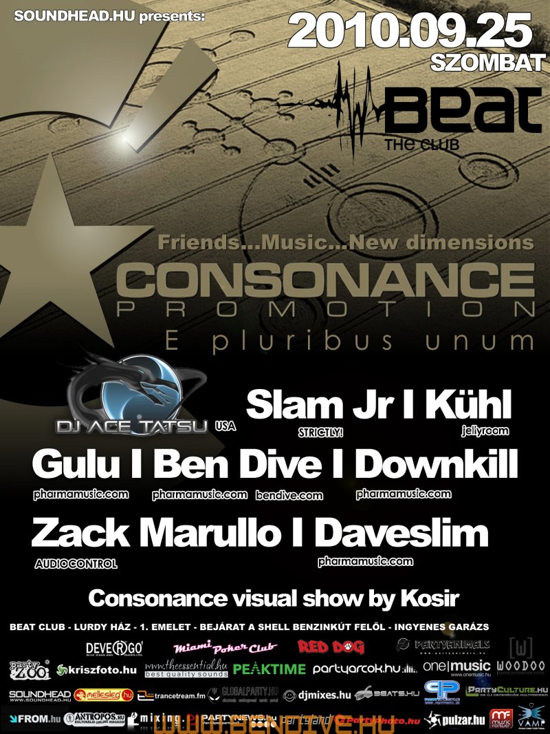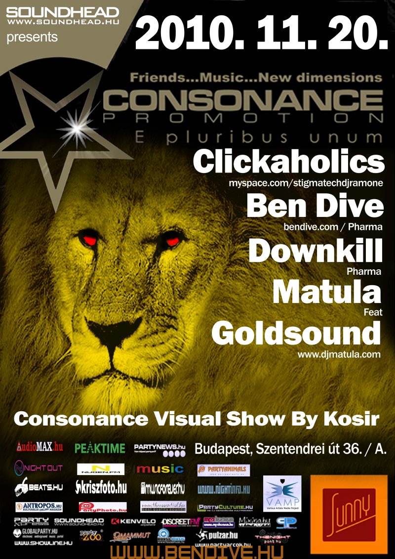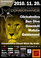 2002-öt írtunk, amikor els?ként testet öltött a Consonance nev? partisorozattal egy régi álom. Ez az álom arról szólt, hogy legyen egy rendszeresen megrendezend? klubest, ahol az összhangra való ösztönös törekvés jellemzi a zenét, a hangulatot, a helyszínt. Innen ered a név is, hiszen minden, ami a világon a létezés fogalmát kimeríti, összhangra törekszik, legyen szó akár egy légbuborék, egy vízcsepp gömbalakjáról, a legegyszer?bb fizikai jelenségekr?l vagy az emberi lélek bels? egyensúlyáról: minden és mindenki igyekszik összhagnban élni, létezni.